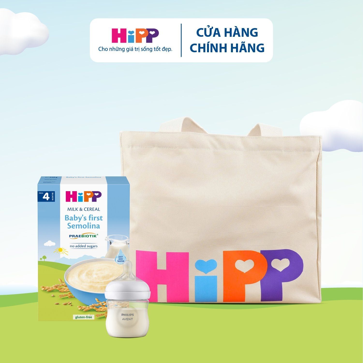 Combo Bột Ăn Dặm HiPP Khởi Đầu Semolina, Túi vải Canvas HiPP và Philips Avent 125ml