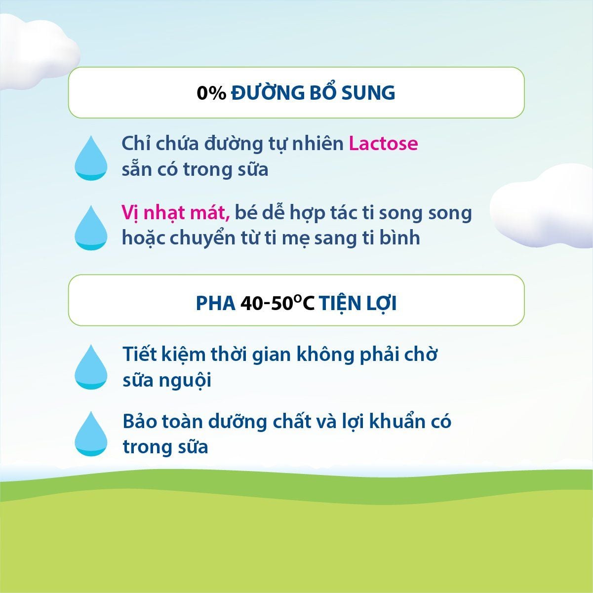 Không đường bổ sung: Vị nhạt mát, bé dễ hợp tác ti song song hoặc chuyển từ ti mẹ sang ti bình.