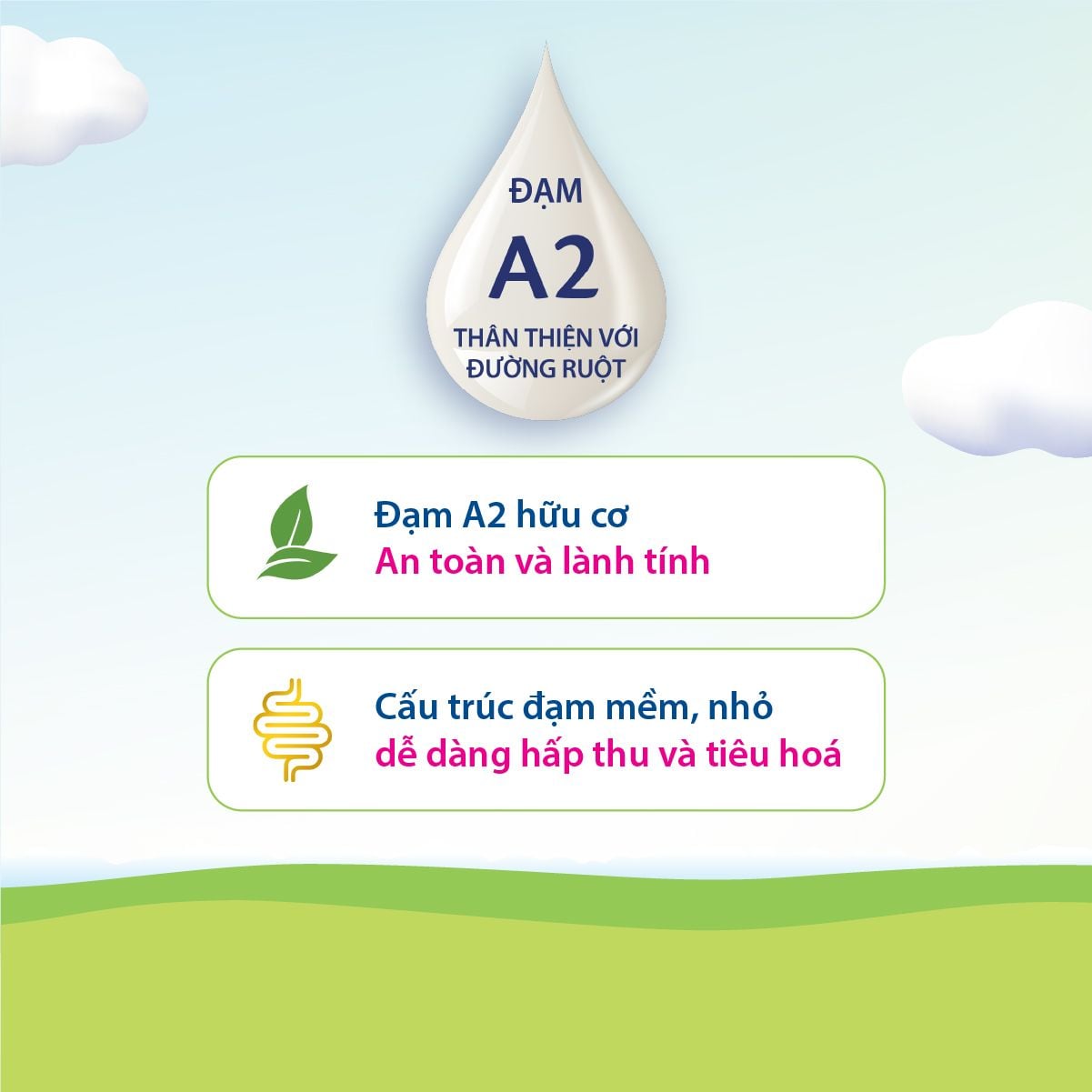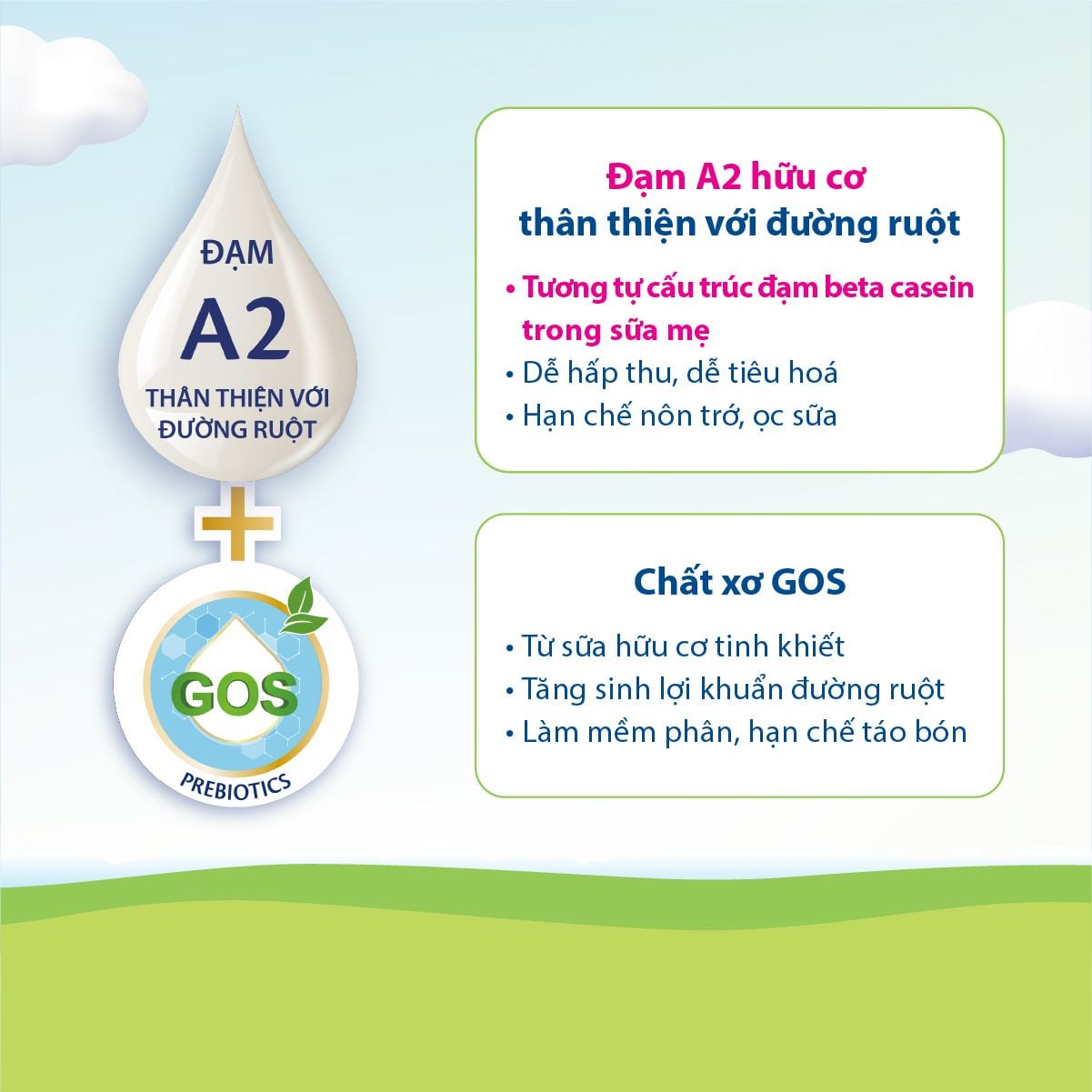 - Đạm quý A2 với cấu trúc tương đương đạm beta-casein trong sữa mẹ tốt cho tiêu hóa và thân thiện với đường ruột của bé, đặc biệt phù hợp với bé có cơ địa tiêu hóa non kém.